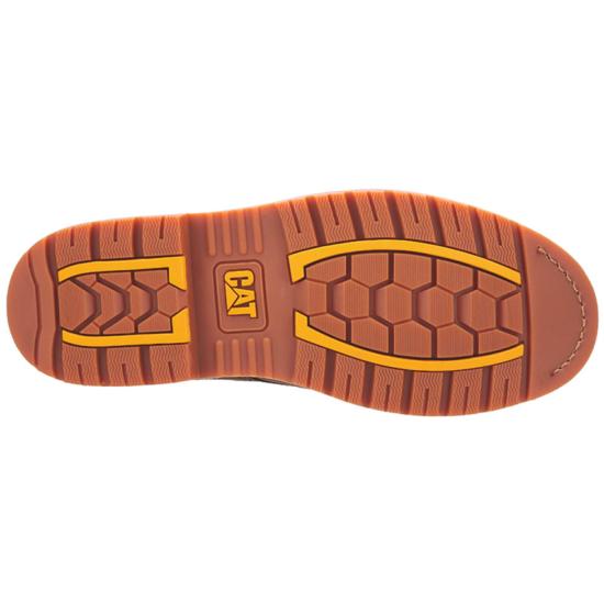 La chaussure haute de sécurité S3 HRO SRA Caterpillar Powerplant combine durabilité et protection avec sa tige en cuir pleine fleur marron hydrofuge et sa construction trépointe Goodyear pour une résistance accrue sur les chantiers exigeants.