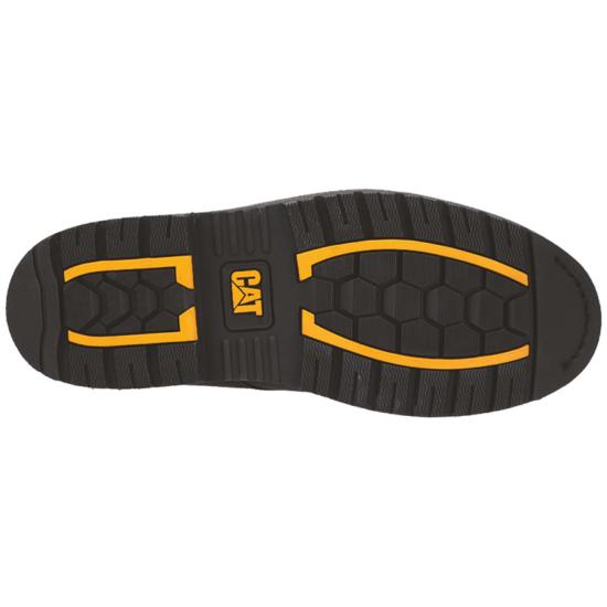 La chaussure haute de sécurité S3 HRO SRA Caterpillar Powerplant combine durabilité et protection avec sa tige en cuir pleine fleur noir hydrofuge et sa construction trépointe Goodyear pour une résistance accrue sur les chantiers exigeants.