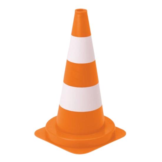Cône de chantier K5a orange 50 cm 100 % PVC recyclé avec embase lestée et 2 bandes blanches peintes. Écologique, empilable et ultra stable, idéal balisage chantiers fermés, voirie privée et parkings.